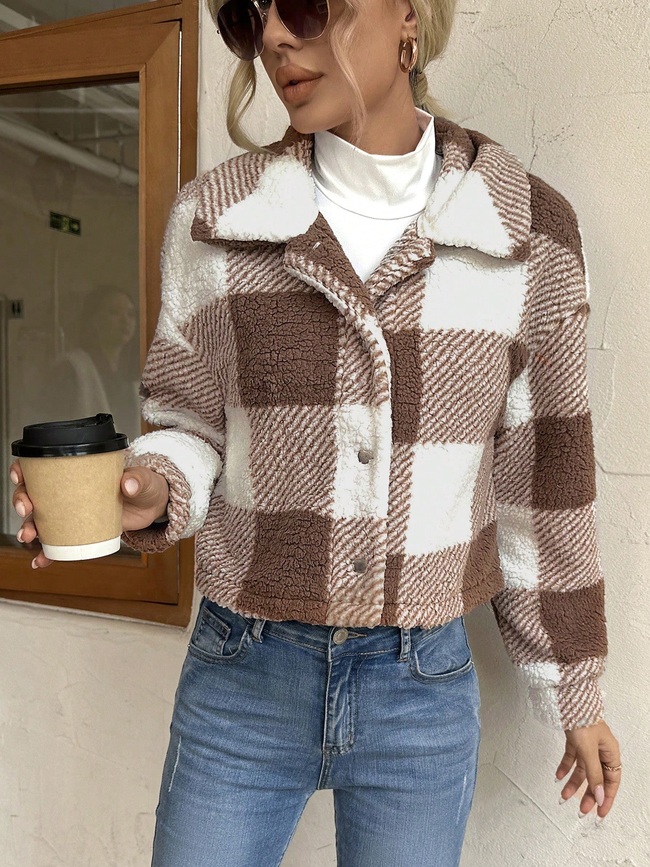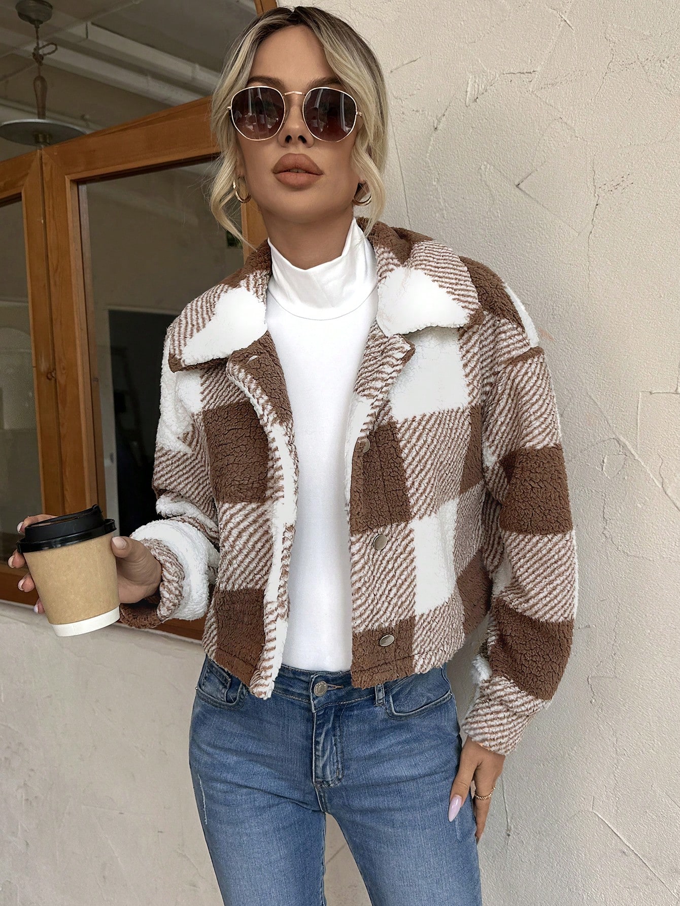 Buffalo Plaid Pattern Drop Shoulder Teddy Jacket
