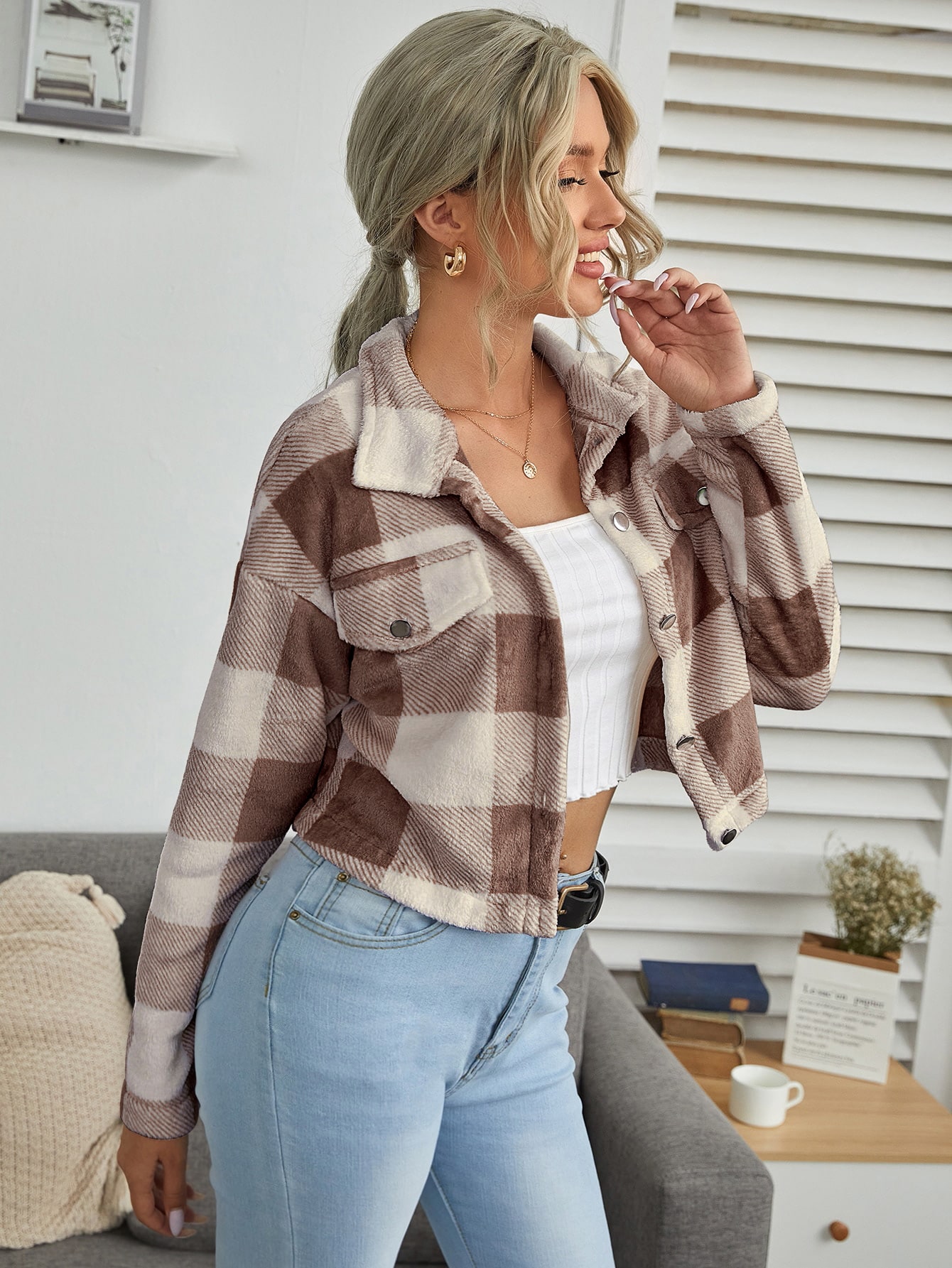 Button Front Drop Shoulder Buffalo Plaid Jacket