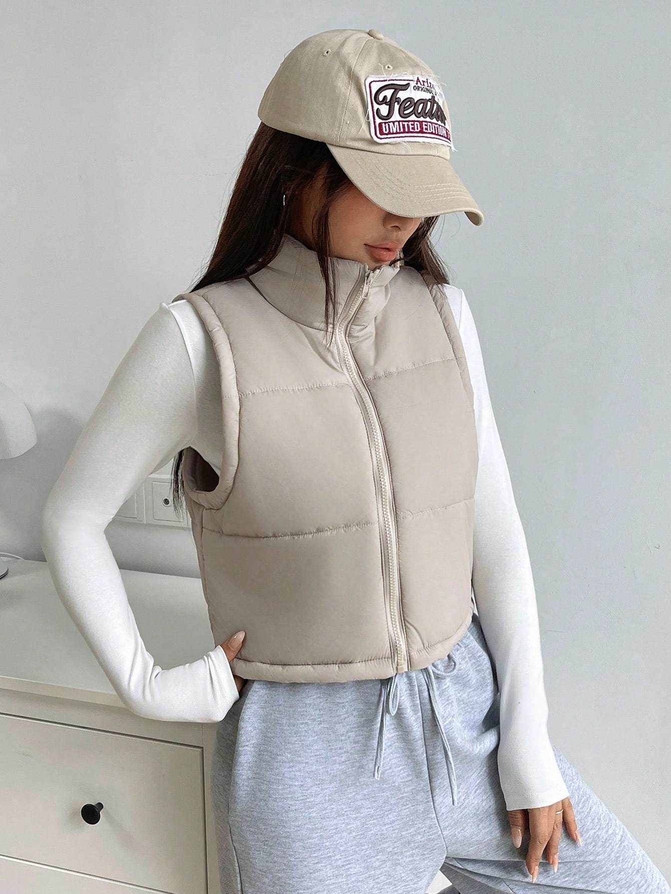 Color: Khaki Style: Casual Pattern Type: Plain Type: vest Neckline: Funnel Neck Details: Zipper Sleeve Length: Sleeveless Length: Crop Placket: Zipper Fit Type: Regular Fit Fabric: Non-Stretch Filling: 100% Polyester Material: Woven Fabric Composition: 100% Polyamide Temperature: Late Fall (10-17鈩?50-63鈩? Care Instructions: Hand wash,do not dry clean Sheer: No
